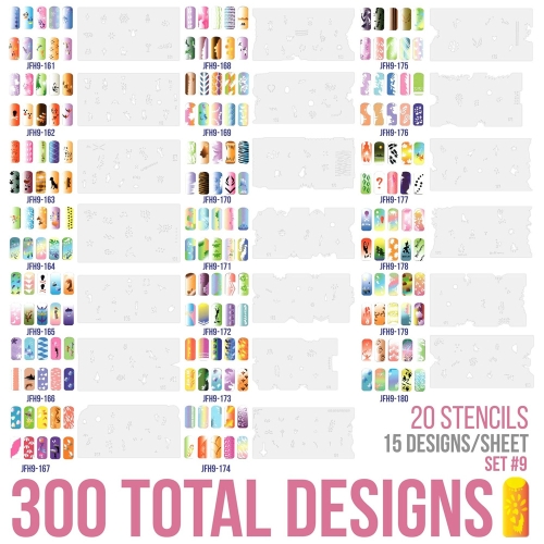 - 20 Sheet stencil set with an average of 15 different nail art design patterns on each 2.5" x 4.5" stencil sheet (300 designs)