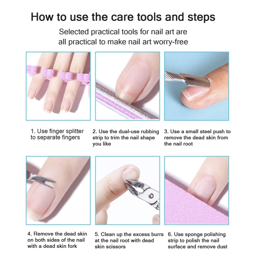 - Great nail polish remover tools 10 in one kit: you will get 2pcs hand soak bowl(blue or pink), 1 pieces nail files and 1 pieces buffer sanding block, 1 pc dead skin fork, 1 pair dead skin scissor, a pair of toe separator,1PC nail brush,1PC cuticle pusher