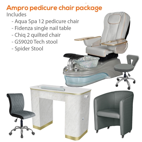 Includes: Ampro spa pedicure chair, Fidenza single nail table, Chiq 2 quilted chair, GS9020 tech stool, Spider stool
