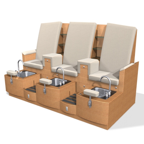 Features upholstered seats in your choice of fabric, two glassretail displays, two large storage drawers, two outlets, upholstered center armrests with apull-out drink tray, and a magazine rack. It has three pedicure stations each with a faucet, a pull-out sprayer, an adjustable footrest, and a stainless steel sink that will not crack or break. Price above does not includes the Aqua Jets or Built-in Heat and Massage.