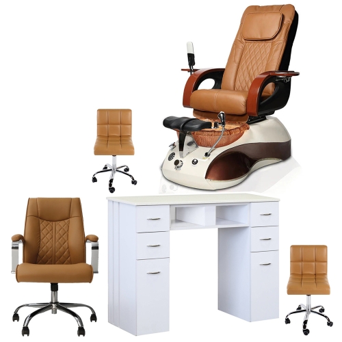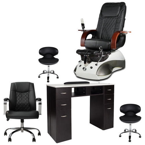 Includes: Empress SE spa pedicure chair, White granite top nail table, Monaco customer chair, Cookie Technician salon stool, Pedicure stool