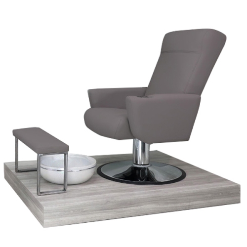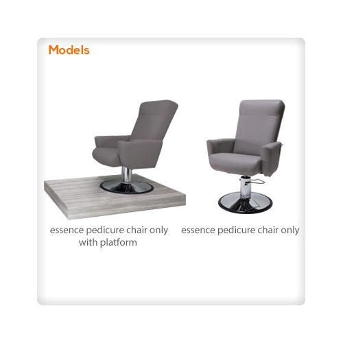 Essence Pedicure Chair offers a minimalistic elegant setting for your Pedicure Room. Reclining ergonomic cushion on a heavy-duty round base with hydraulic pump. Optional built-in heat and vibration. Pair Essence chair with Balance Foot Rest, Trio Foot Spa. Add Raised Platform and finish with Nail Tech Stool. The Essence of a Pedicure.