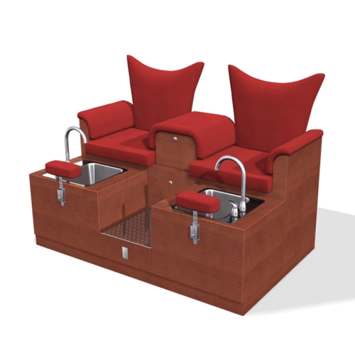 Features curved seats in your choice of fabric, an upholstered center armrest with a pull out drink tray and magazine rack, a large storage drawer, an outlet, two pedicure stations, each with a faucet, a pull-out sprayer, adjustable footrest and a large stainless steel sink that will not crack or break. Price above does not includes the Aqua Jets or Built-in Heat and Massage.