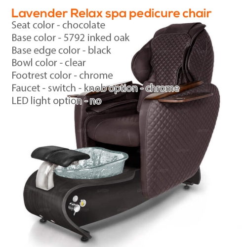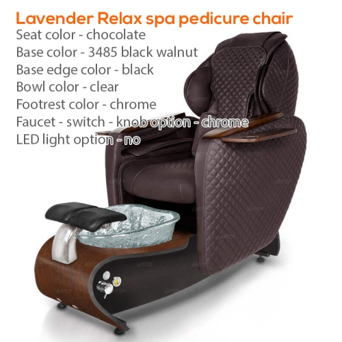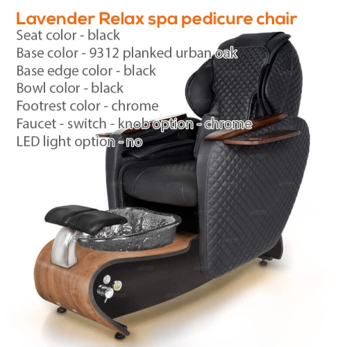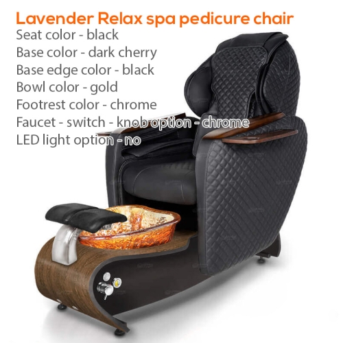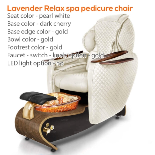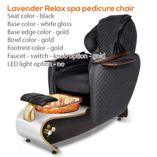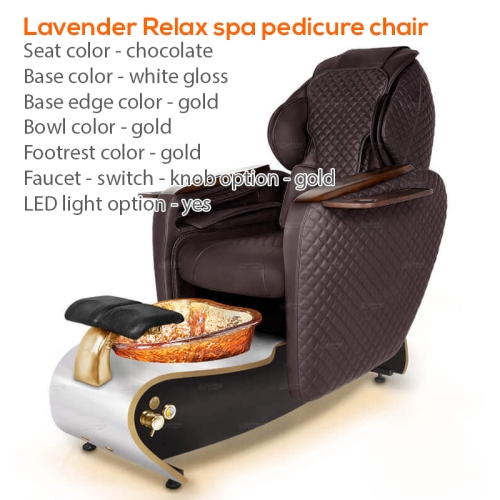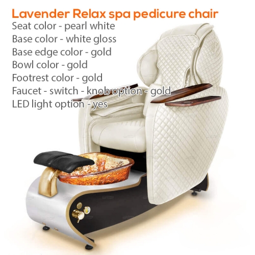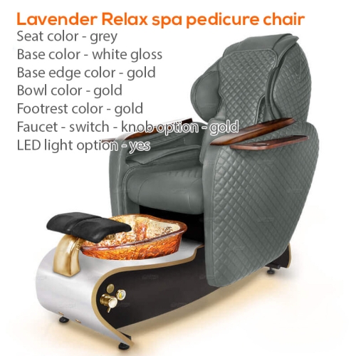 The Lavender Relax Spa comes with Super Relax Chair with the unique design of a pedicure chair that has a relaxing upper body massage and Gulfstreams revolutionary 360-degree versatile footrest. Each pad can be turned, lifted and used in many different positions, and can come in our unique gold model as well as our standard chrome.
