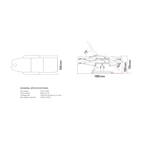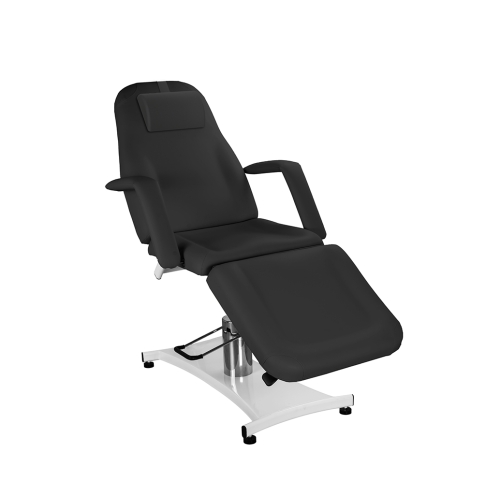 Functional and high stable 3-section chair with a hydraulic pump that controls height. Backrest and legrest inclination is adjustable by gas lift. Removable armrests. White PU upholstery of high quality that eases cleaning.