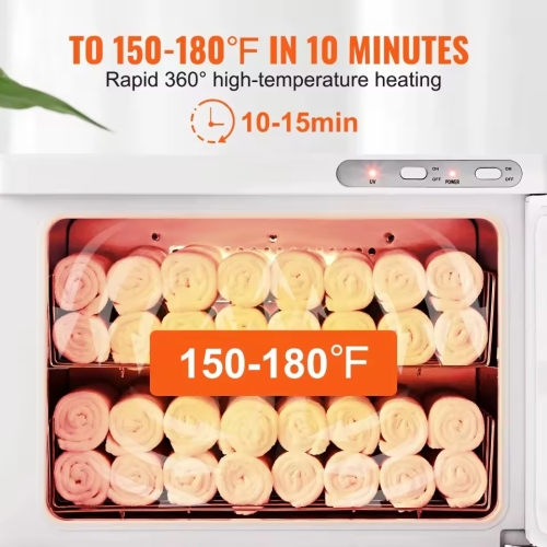 - Our towel warmer cabinet with a large 23L capacity, accommodates up to 60 face towels. With uniform heating from all sides, it ensures more efficient heating. Equipped with a UV light and an aluminum oxide interior, it's built to last, making it suitable for a wide range of uses.