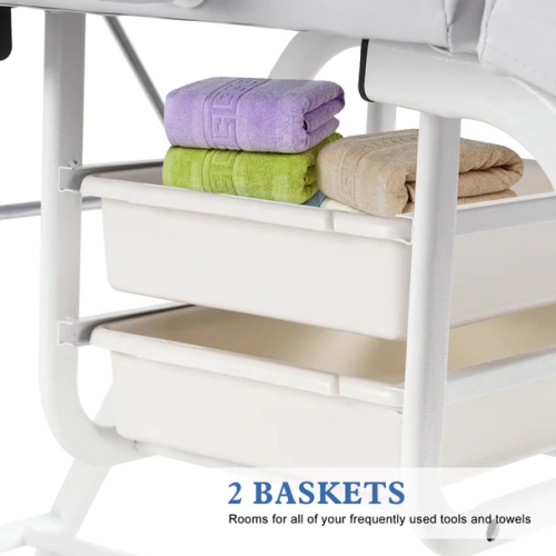 - Humanization Design: Removable head cushion with a face hole, which is convenient for the conversion of massage postures. Filled with rebounding sponge and high-density foam, assembled two high-capacity baskets for storage, the bed ensures comfortable user experience from every tiny detail. Customers can enjoy a more comprehensive experience brought by the beauty bed with ergonomic design.