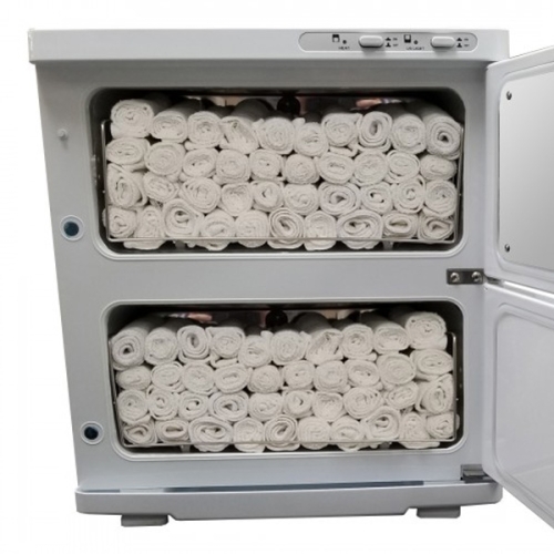 This 2 door modern hot towel cabinet is one of the best compact hot towel warmers on the market. Warm towels are a soothing, cleansing treatment for spa and massage clients. It is CE listed and offers high-demand quality features. Rust-proof aluminum interior maintains an internal temperature of 170°F. Towel rack and silicon door seal for heat retention and quiet operation. Includes a water collector tray to remove excess moisture.