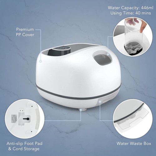 - High Efficiency & Steam Heating: Our foot bath uses innovative steam heating simply by pouring a cup of water into the 446ml-capacity water tank. The foot bath steam massager will provide you with an enjoyable steam sauna spa experience for up to 20 minutes without frequent refills, which saves water and energy.