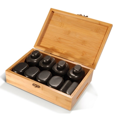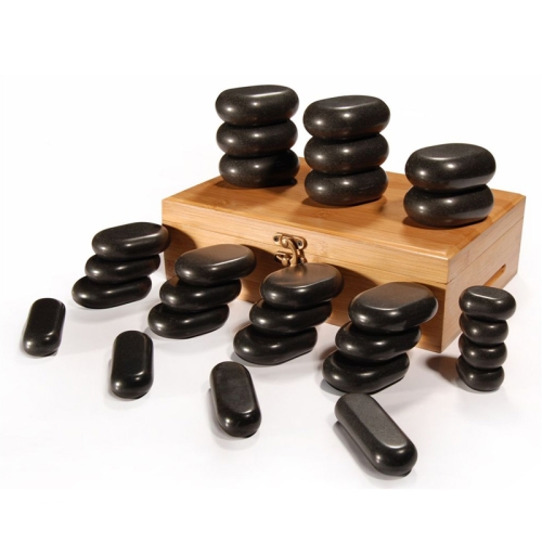 28 pcs Body Massage Stone Set Consists of : 8 Large Flat Oval Basalt Stones, 12 Medium, 4 Small, 4 Mini Pressure Point, Total 28 pcs packed in Bamboo Organizer Box.