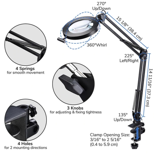 Yescom Black Clamp-On Illuminated 5x Magnifier Lamp with T-shaded Handle is ideal for Reading, Salon Hobbyists, Beauticians, Circuit Board Inspection or just as a Vision Aid. It is convenient to use as its lens head can rotate left and right with 360° and flip up and down 270°. With the desk clip, you can easy assemble it in any position.