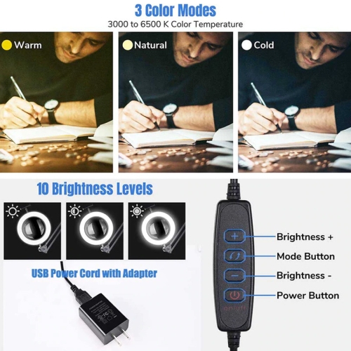 - 3000 to 6500k energy saving LED lamp with 72 pcs light beads features 3 color modes including cold, natural & warm white and 10-level brightness adjustment