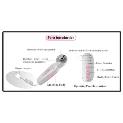 Uses Infra Red/Blue/Green LEDs and ultrasonic pulses to deep cleanse, exfoliate, massage, lift, and infuse water soluble products into the face.