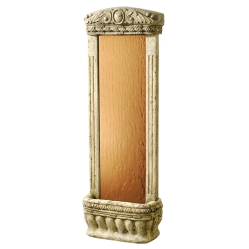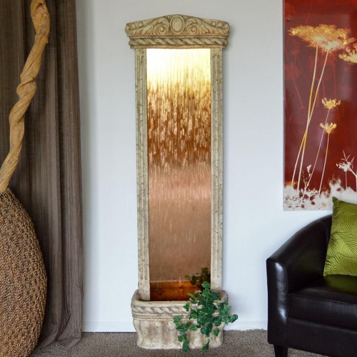 72" Ancient Stone Frame & Bronze Mirror.Bring the outdoors into any interior space with the lovely Watergarden waterfall. Made of a durable fiber composite material, this water feature will introduce the peaceful sound of falling water into any environment. The water flows down a smooth glass mirrored panel to create a captivating water effect. Quiet and easy to install, it humidifies and cleanses the air, making it a welcome addition to any home. The basin can be accented with the included silk plants, or those of your choice by putting them in the pipettes found in the reservoir. Lightweight and durable, it can be set on any level surface. Equally suited for outdoor use.