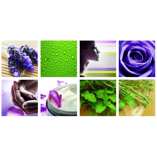 This stunning canvas mural features fresh green and violet images; the eight pieces can be arranged together or separately throughout your space to establish a soothing atmosphere for your clients and encourage them to relax upon entry.