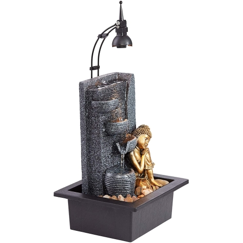 From a covered patio to a sunny spot in a master suite, this energy-efficient LED indoor/outdoor table fountain delivers peaceful and soothing vibes to any space. Crafted in lightweight resin for easy movement, the stone and black fountain features a tiered cascade of water with a gold finish kneeling Buddha perched to one side. An included LED light delivers 200 lumens of light, equivalent to a 20-watt halogen, with a soft white 2700K color temperature.