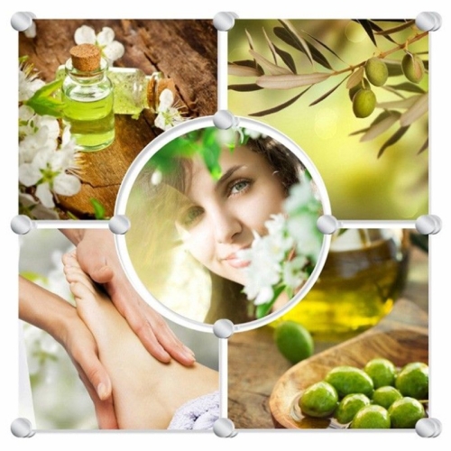 - Bright, serene standoff glass mural featuring plump green olives and relaxing spa images