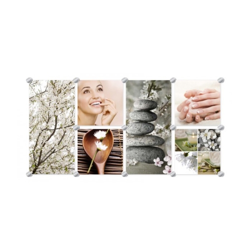 • Give you salon a vibrant and contemporary look with these beautiful glass mural sets. Each mural is encased in sleek glass for a shiny finish. Each set includes silver metal stands.