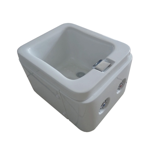Durable, white acrylic pedicure soaking tub. Foot Bath is designed to be plumbed in place and has convenient water controlls on tub side and low profile faucet for filling. Best used with floor drain. This soaking tub works well with Harmony and Destiny Foot Massage Chairs and can be covered by the Ottoman when not in use. Also use with Motorized Breath Pedi-Lounge.